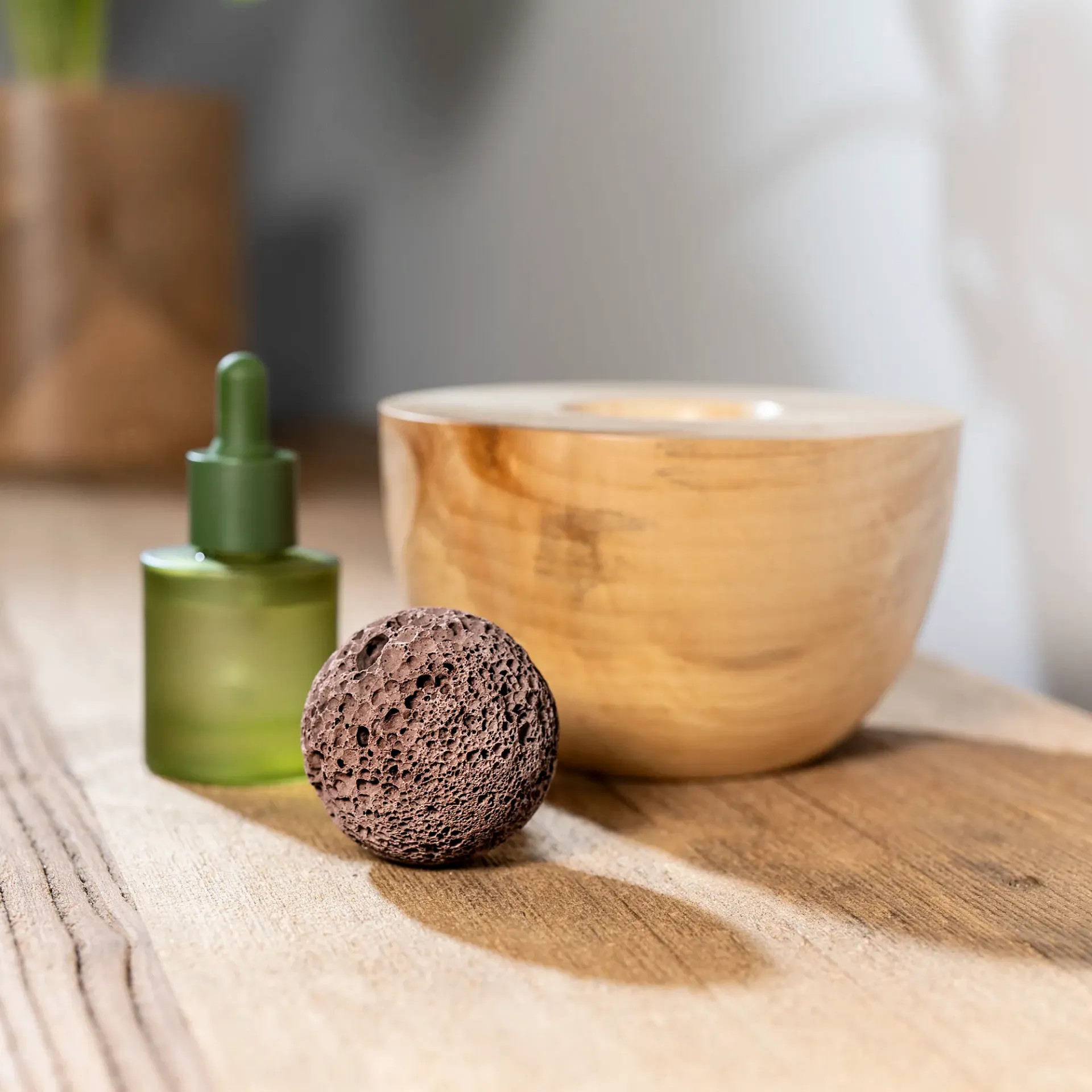 Pět centimetrů velká pórovitá lávová koule nasátá vonnou esencí, usazená do těla spaltovného jasanu.