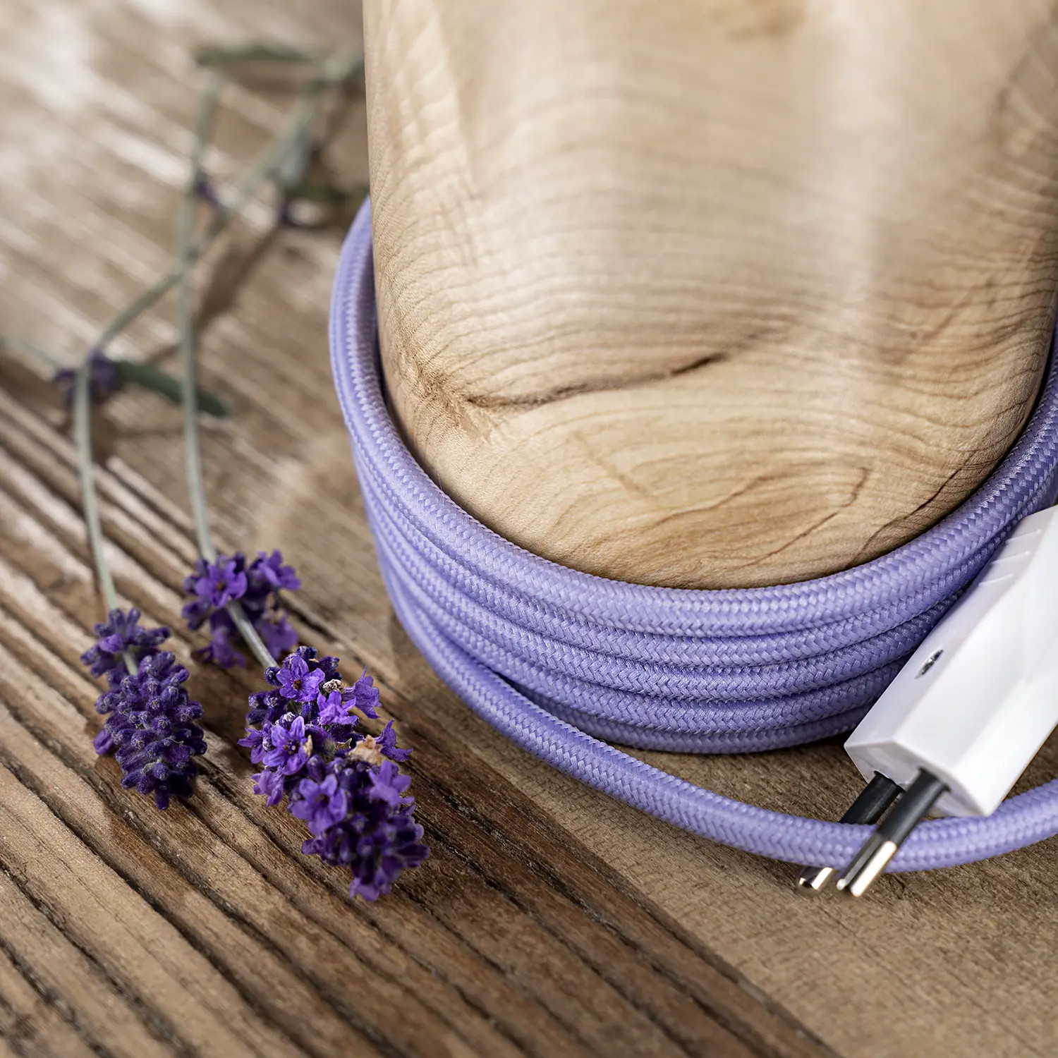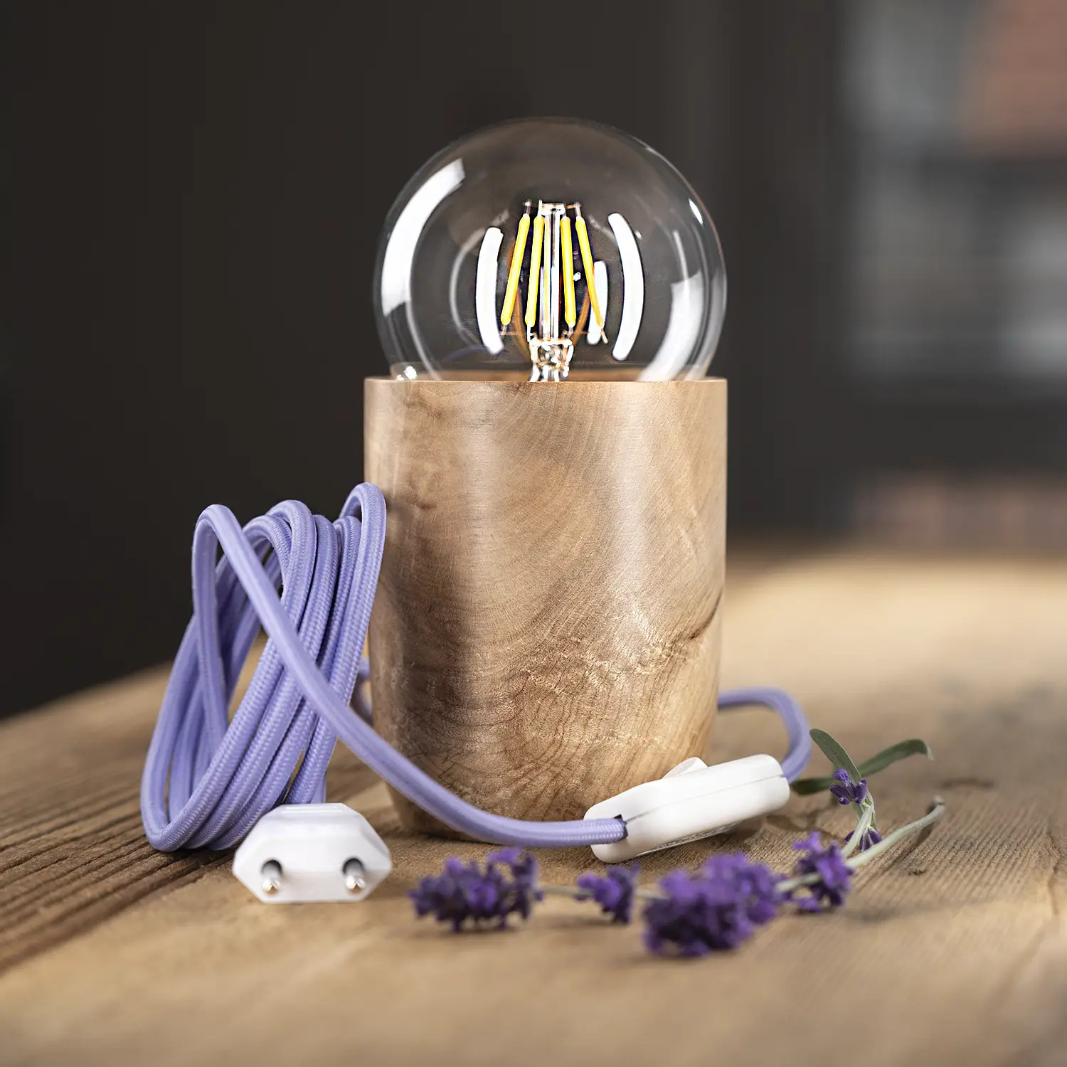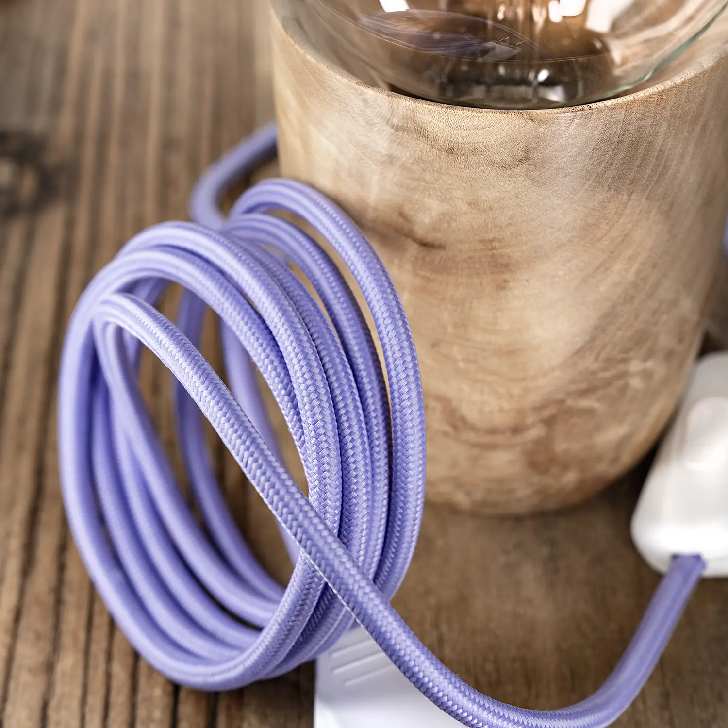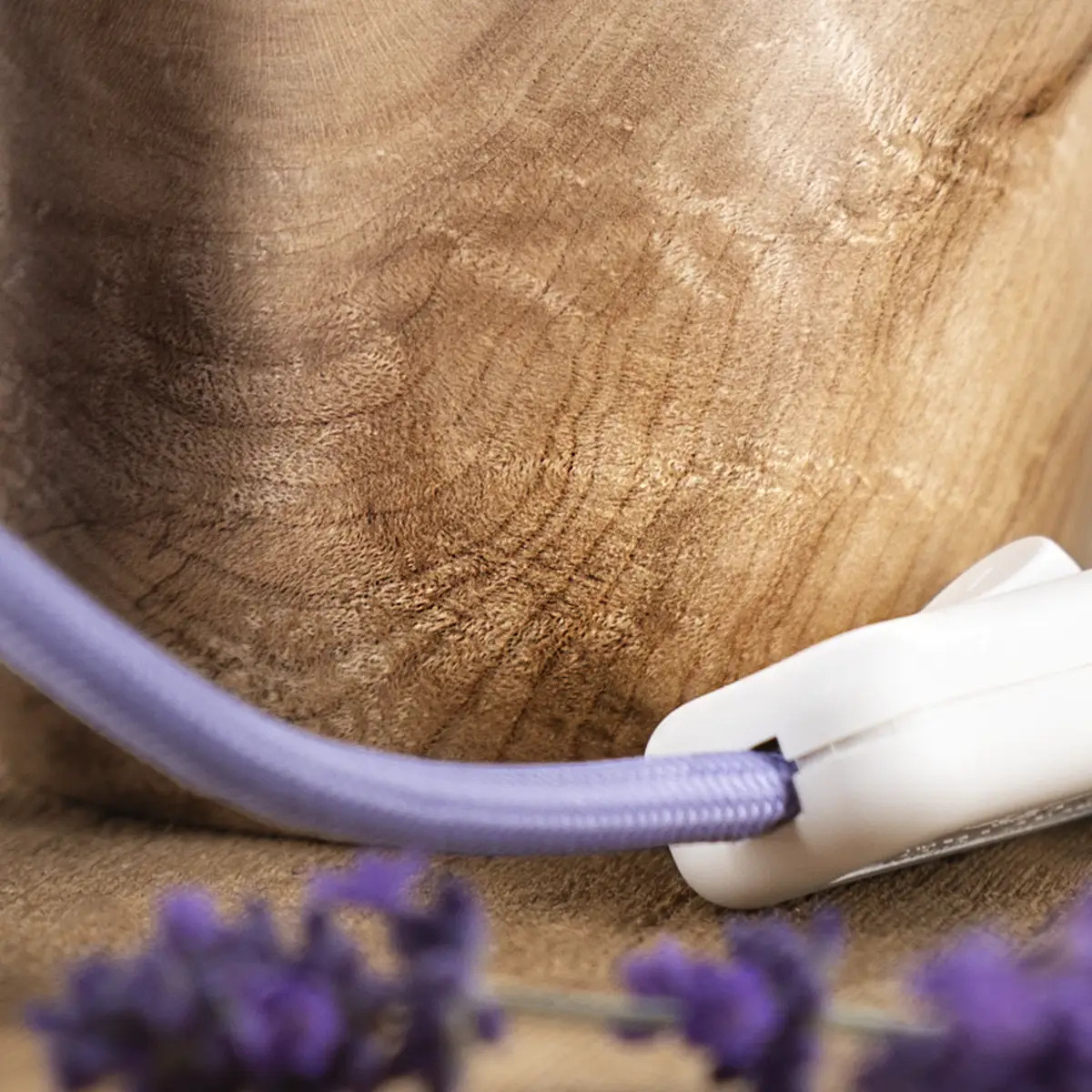 Pletený fialový kabel — to je léto, vůně levandule a fialek. Bílé doplňky a velká designová LED žárovka – teplé, zapadající slunce. Lila je léto, jak má být.