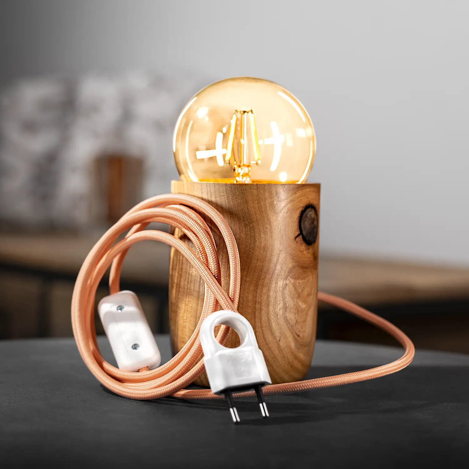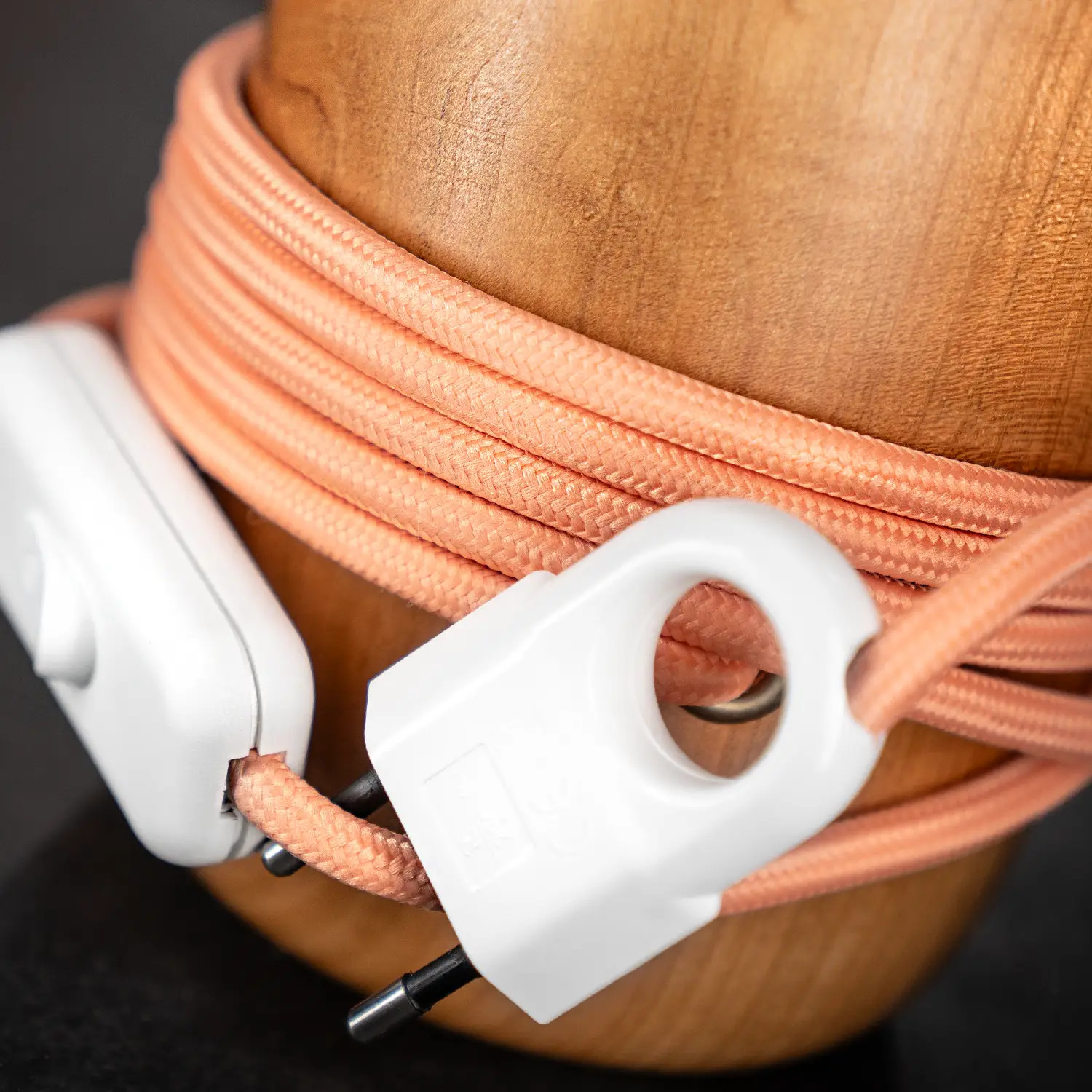 Dřevěné tělo plné teplých barevných tónů, od svěží oranžové až po medový jantar je doplněné krásným opleteným kabelem s bílými komponenty: vypínačem a zásuvkovou vidlicí. Sametový povrch dřeva je napuštěný několika vrstvami přírodního oleje a vosku, aby vynikla jeho přirozená kresba.