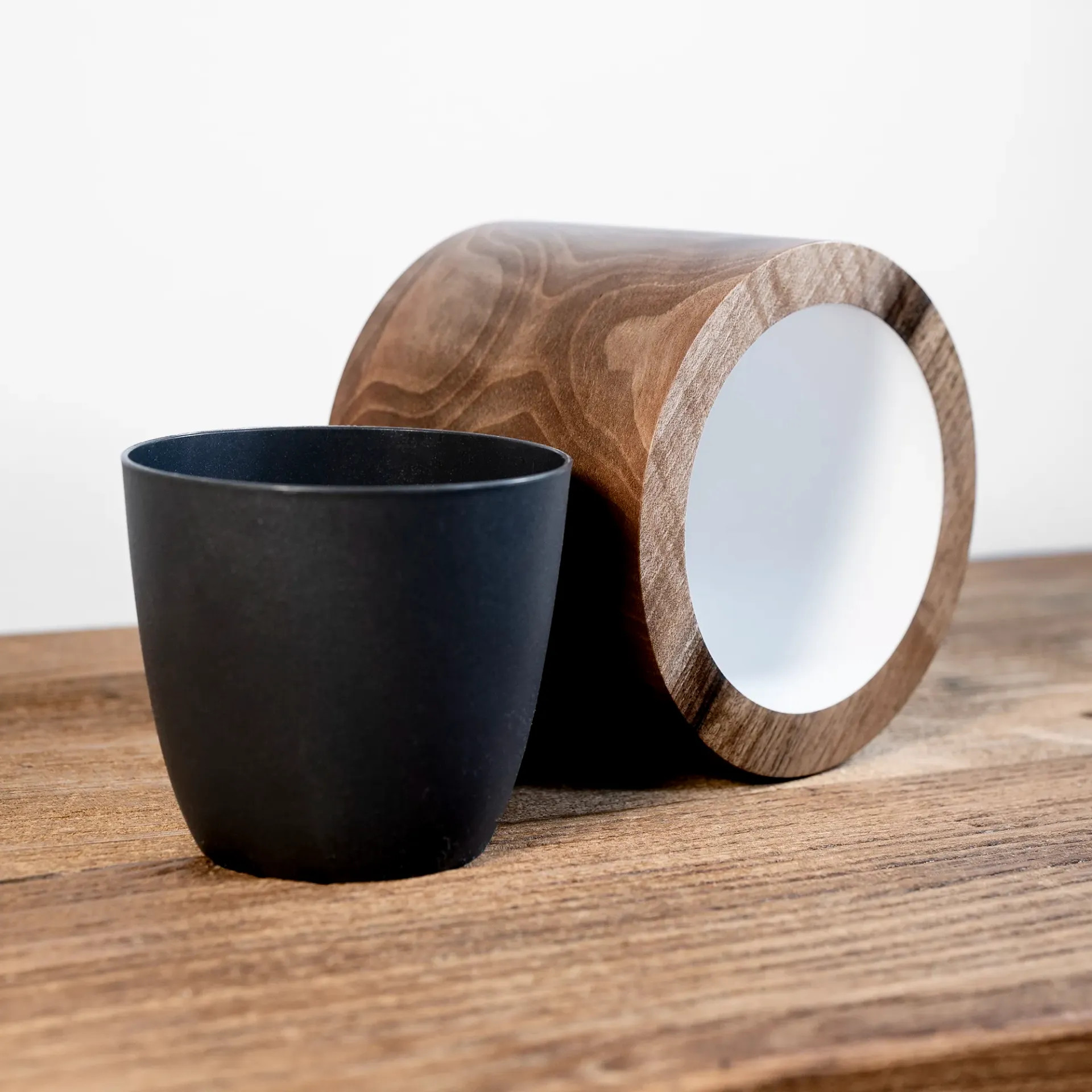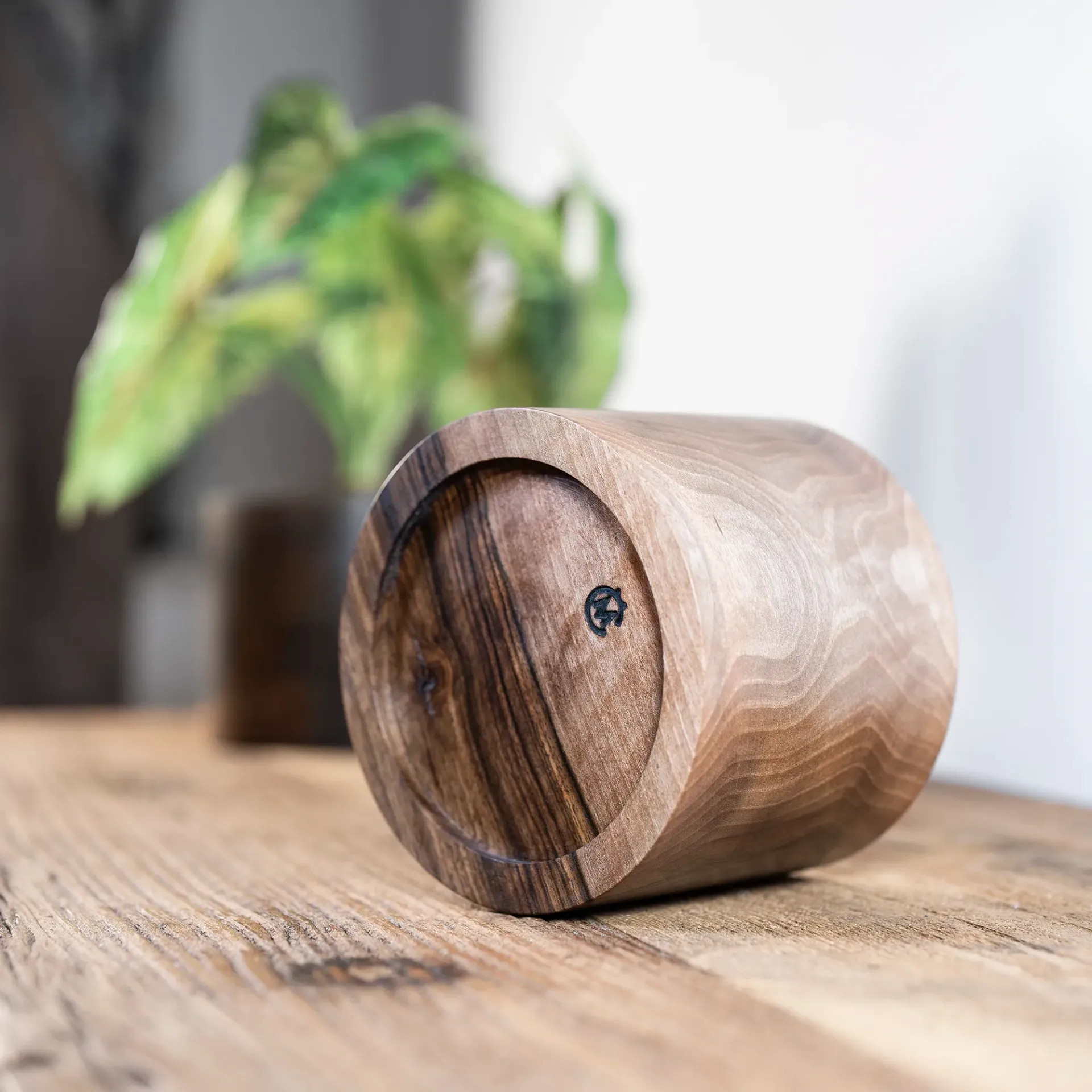 Ručně soustružený květináč z ořechového dřeva, ve kterém se kresba letokruhů přelévá jako tichá řeka. Každý přechod barvy, každý jemně vlnící se detail je otiskem času, během kterého dřevo stromu po dlouhá léta budovalo svůj nezaměnitelný charakter.