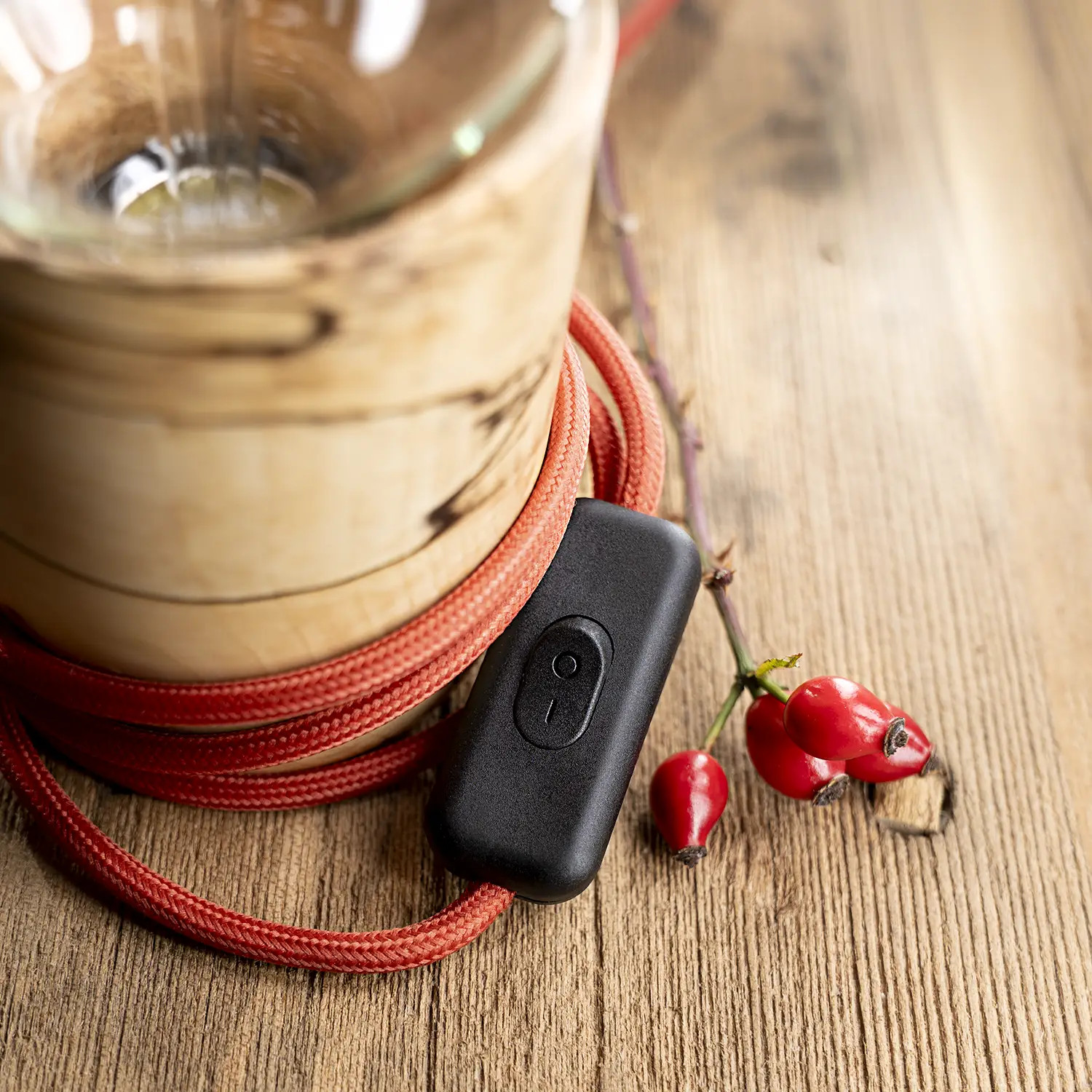 Rozárka má v sobě jiskru, radost i eleganci, podtrženou červenou barvou textilního kabelu a černými doplňky, které jako by přenášely spalovanou kresbu dál do prostoru.