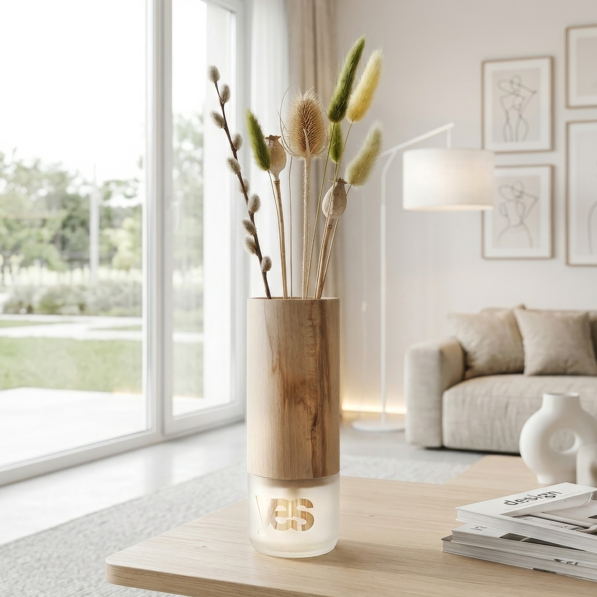 Vysoký, ručně soustružený top z bukového masivu precizně zalícovaný na ručně seříznutý, vybroušený a znovu dokonale zaleštěný skleněný základ. Do křišťálově bílého skla pískovaný motiv "yes".